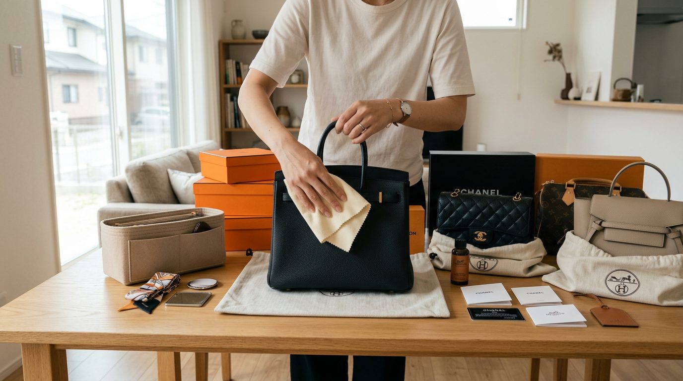 革専用クリームや洗剤を使った手入れは、素材に合わないとシミや変色の原因になることがあります。自信がない場合は無理をせず、簡単なホコリ取りと形を整える程度にしておくと安心です。「きちんと大切に使っていた」印象を与えられるだけでも、査定時の心証がよくなりやすいので、最低限のケアは済ませておきましょう。